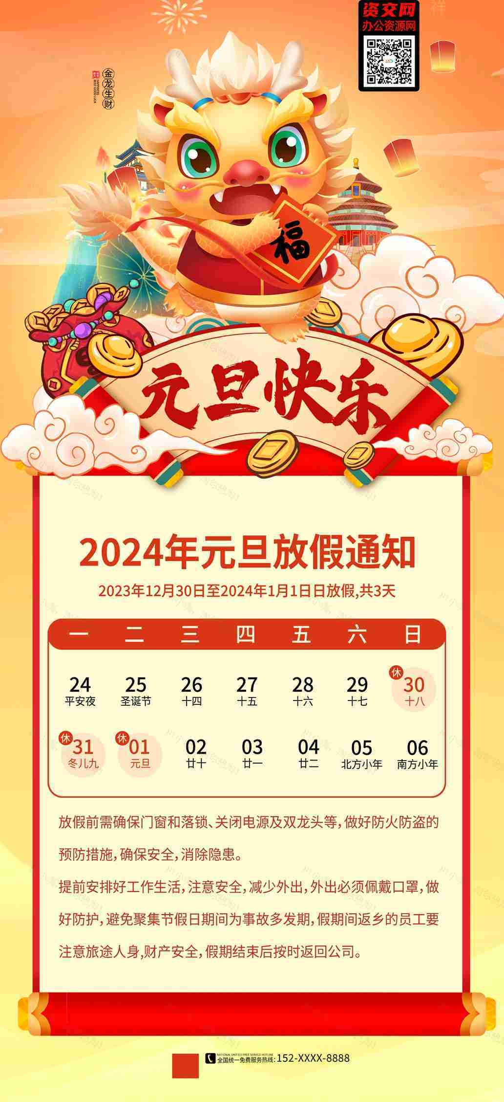 2024龙年春节元旦金龙生财放假通知海报模板免费下载