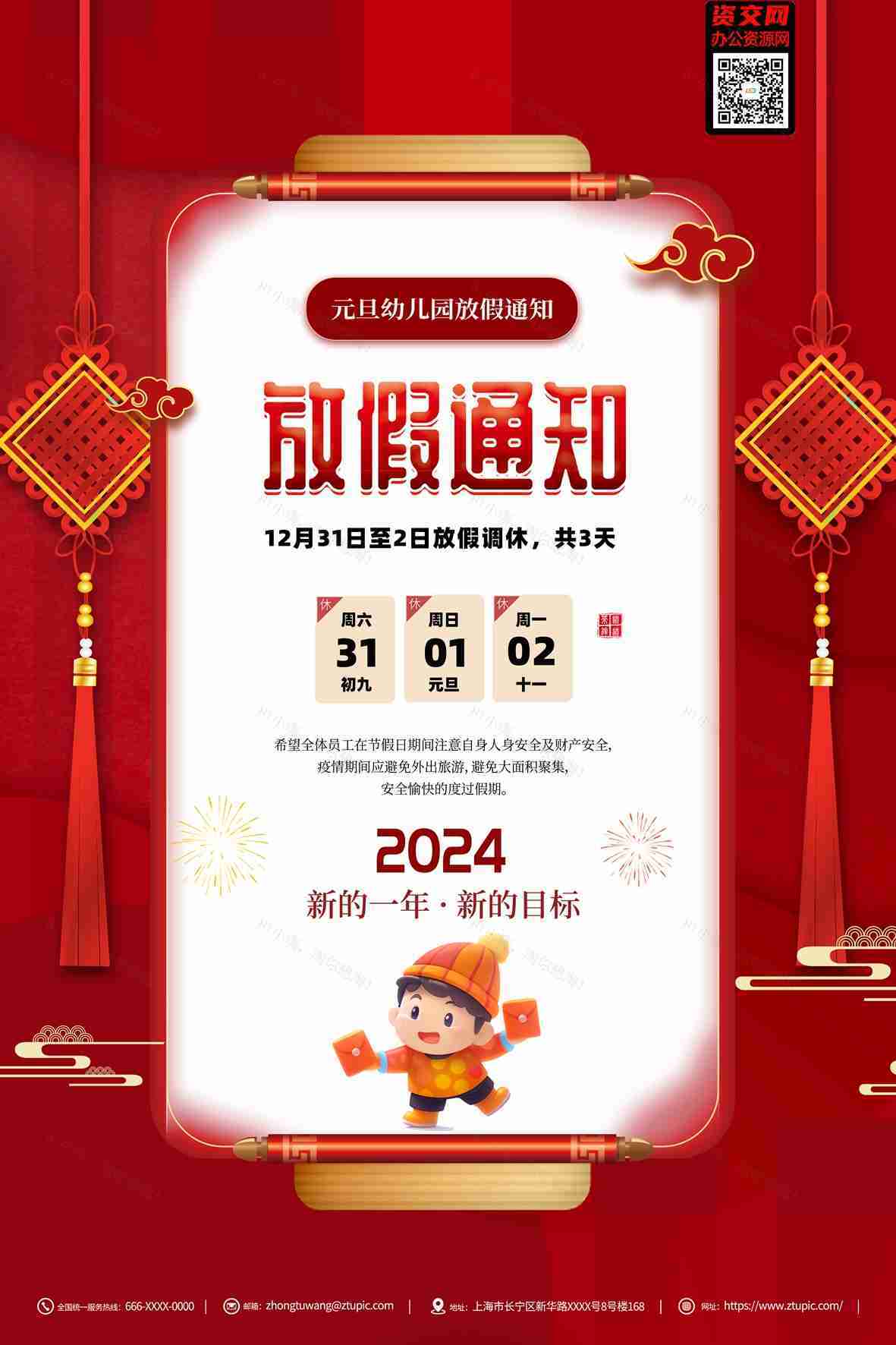 2024龙年春节元旦幼儿园放假通知海报模板免费下载